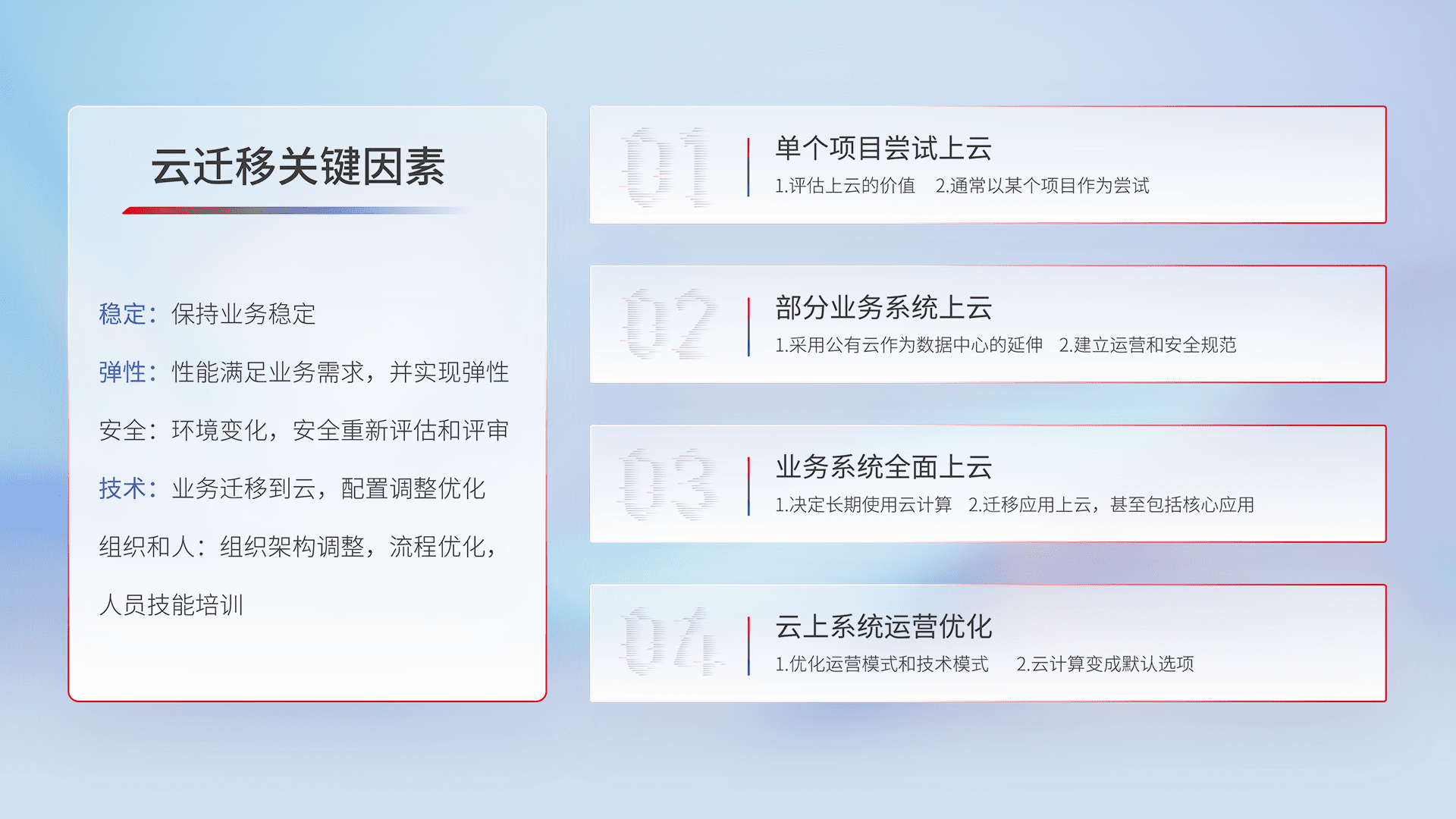 结合实际业务,,,从规划设计、、、云平台选型、、、、云原生改造、、、、数据迁移、、、、集成交付,,,,迁移全过程为客户识别最佳上云路径,,做好风险识别管理,,,,设计网络架构、、身份权限、、、安全审计合规、、、、操作审计、、、日志审计、、监控告警策略、、、多站点容灾设计等,,对云上基础设施进行整体规划,,,提升IT治理水平,,,以满足弹性、、、高可用、、、、高性能的需求。。。。