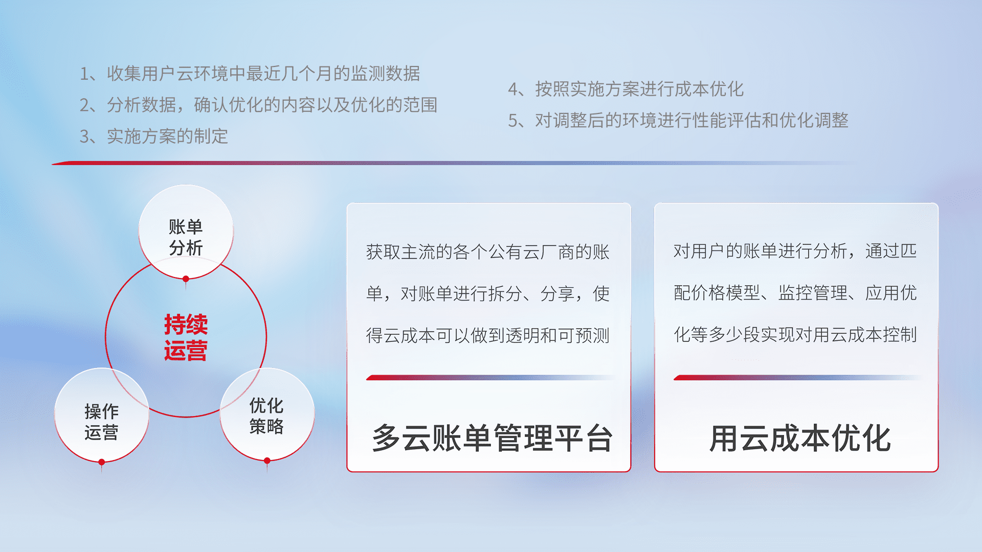 通过多云纳管,,,,以统一的资源数据模型把客户的云资源进行抽象和封装,,进而实现对多云资源的统一操作,,保障云资源管理的可靠性、、稳定性与可用性。。量身定制化运维内容,,,,配置、、开发运维、、、、补丁管理、、、、备份、、、、监控、、、认证和访问管理、、、、审计和日常巡检等,,,保障在用云过程中的可靠度,,稳定度以及高可用率。。